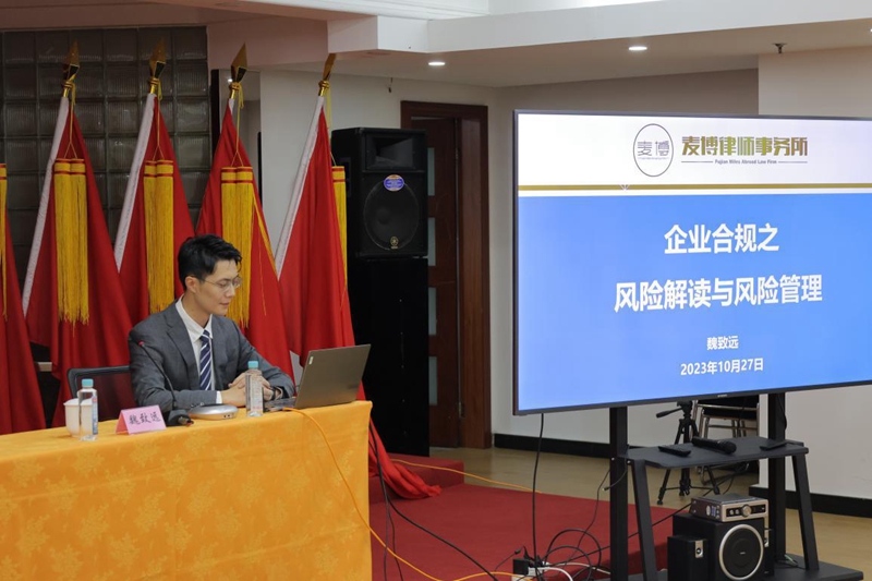 為深入學習貫徹習近平法治思想,落實全面依法治國戰略部署,2023年10月27日,福建輕紡邀請福建麥博律師事務所合伙人魏致遠律師為公司開展題為《企業合規之風險解讀與風險管理》的2023年度依法治企培訓班。