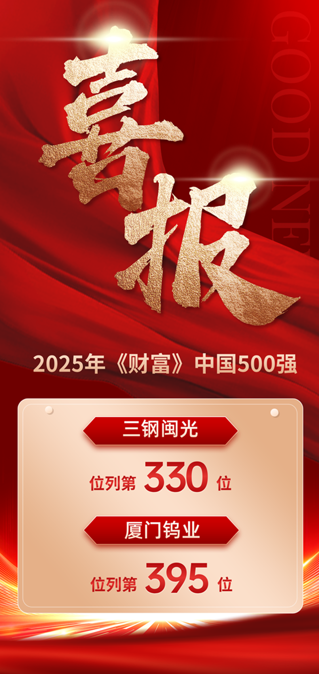 7月22日,2025年《財富》中國500強排行榜揭曉,省工控集團權屬企業三鋼閩光、廈門鎢業上榜。