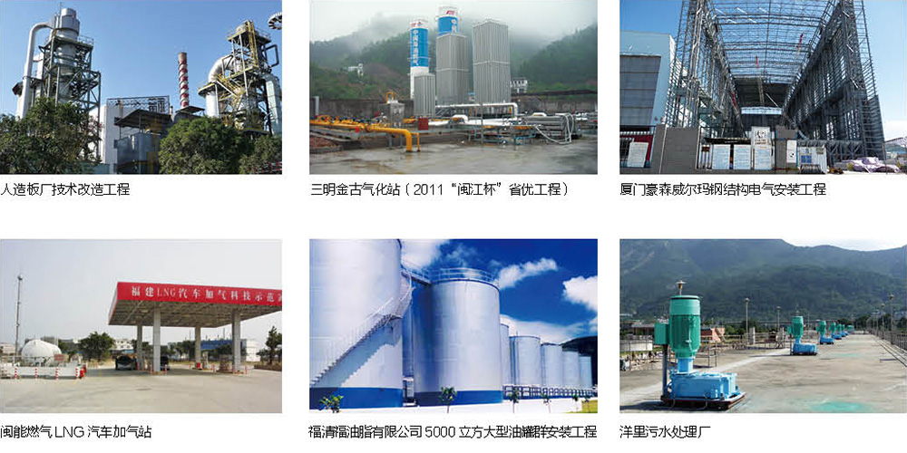 公司能夠承接重型工業、輕紡工業、石油化工、工業鍋爐熱電、電子信息工業、醫療制藥業、民用工程、消防工程、市政工程等大中型工程。承建有亞洲最大氯酸鹽產量,氯酸鉀規模世界第一的福州一化集團技改工程;亞洲第一的青山紙業皮紙脫墨生產線工程;福建省東南電化集團15萬噸/年產PVC技改工程;福州市中亭街址六萬平方暖通工程;馬尾船政海洋工程裝備及特種船舶項目陸域工程第一、二部分投資建設項目等。